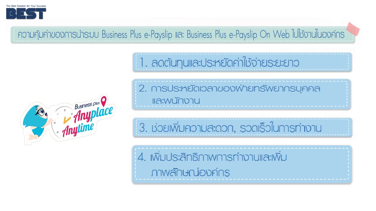 1. ช่วยลดต้นทุนและประหยัดค่าใช้จ่ายระยะยาว 2. ช่วยประหยัดเวลาของฝ่ายทรัพยากรบุคคลและพนักงาน 3. ช่วยเพิ่มความสะดวก, รวดเร็ว ในการทำงาน 4. ช่วยเพิ่มประสิทธิภาพการทำงาน และเพิ่มภาพลักษณ์องค์กร