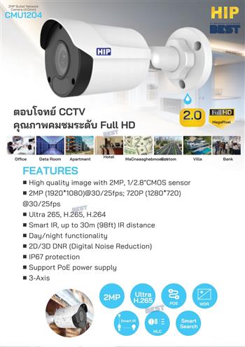 HIP Bullet 2MP รุ่น CMU1204 (4.0mm) กล้องวงจรปิด HIP คุณภาพภาพคมชัดระดับ Full HD ความละเอียด 2MP ปลอดภัย 100% ดูแลอาคารและทรัพย์สินของคุณตลอด 24 ชม.