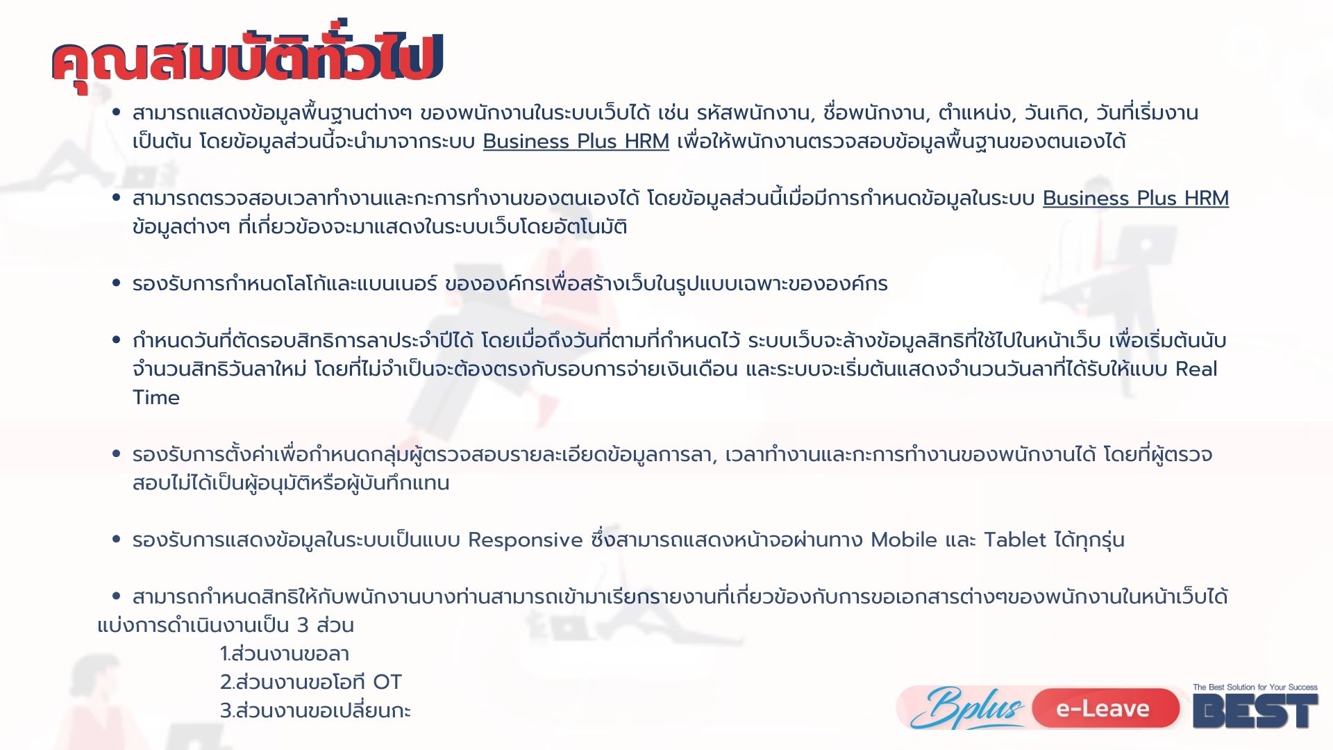 Bplus e-Leave ส่วนบริหารจัดการขอลา ระบบที่ช่วยให้พนักงานสามารถยื่นเรื่องขอลาออนไลน์, ขอหยุดงานต่างๆ และยื่นเรื่องขอทำโอทีออนไลน์ได้โดยไม่ต้องกรอกแบบฟอร์มต่างๆ ของบริษัท เพียงแค่บันทึกรายละเอียดการขอหยุดงานหรือขอทำโอที และขอเปลี่ยนกะผ่านเว็บ