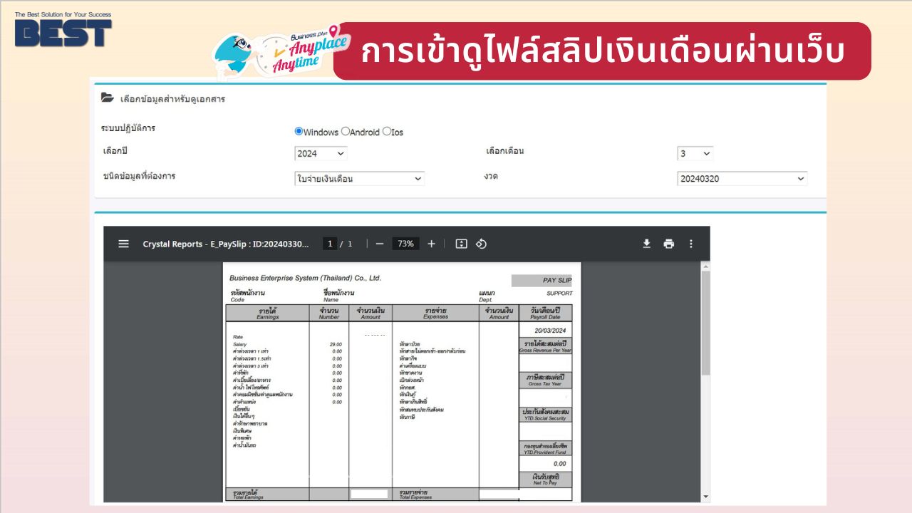 Bplus e-Payslip โปรแกรมพิมพ์ใบจ่ายเงินเดือนให้พนักงานรูปแบบ Electronic File และส่ง E-Mail ให้พนักงานได้ทันทีโดยพนักงานแต่ละคนจะมีรหัสลับเพื่อความปลอดภัย ในการเปิดเข้าดูข้อมูลเงินเดือน ซึ่งเป็นความลับเฉพาะคน และความลับขององค์กร รวมทั้งยังสามารถส่งเอกสารหรือรายงานอื่นๆ ให้พนักงานทาง E-Mail ได้ทำนองเดียวกับใบจ่ายเงินเดือน นอกจากนั้นพนักงานยังมีช่องทางพิเศษสะดวกในการรับข้อมูลได้อีกคือทาง SMS หรือ App Bplus HRM Connect